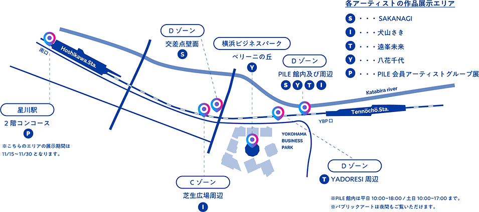このプログラムの最終ゴールとして展開してきたパブリックアート展では、相鉄本線「天王町駅」〜「星川駅」までの高架下壁面や、野村不動産「横浜ビジネスパーク」等のパブリックスペースでアーティストが作品展示を行い、同エリアに住む様々な方々に見てもらう機会を生み出してきました。
